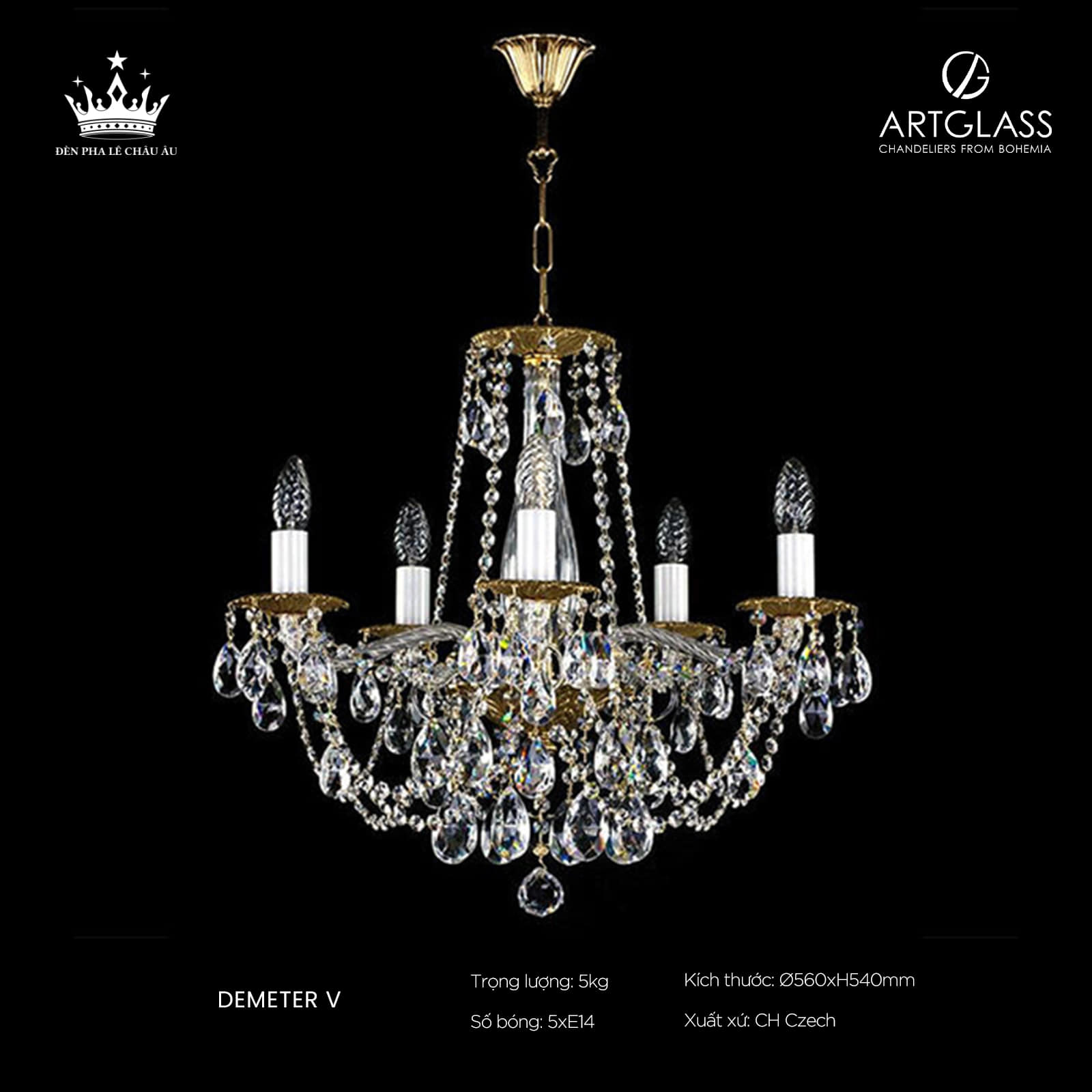 Đèn chùm DEMETER V được thiết kế với 5 tay gọng pha lê cao cấp, kết hợp cùng khung và trục bằng đồng nguyên chất chắc chắn, mang đến độ bền vượt thời gian. Từng hạt pha lê được chế tác tinh xảo, tỏa sáng lung linh, tạo nên không gian sang trọng và quý phái.