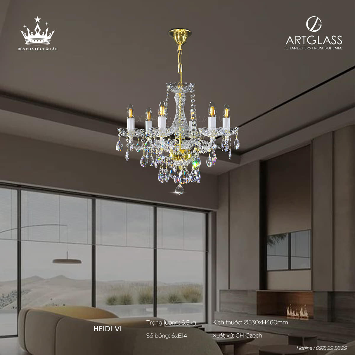 Đèn chùm pha lê HEIDI V. CE sở hữu thiết kế tinh tế với 5 nguồn sáng, kích thước 53 x 46 cm (tổng chiều cao 72 cm). Điểm nhấn của đèn nằm ở những hạt pha lê Crystal Exclusive lấp lánh, kết hợp cùng khung đồng thau nguyên khối sang trọng.