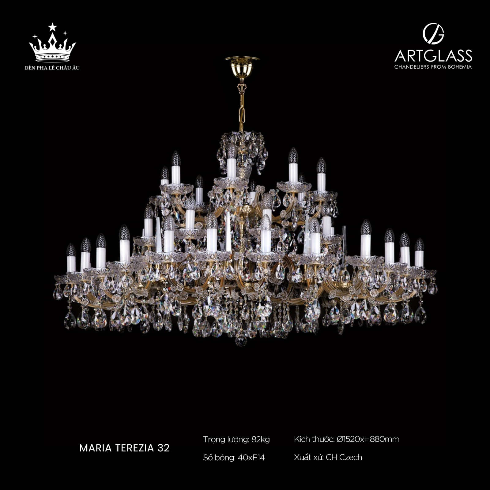 Maria Theresa 32 là tuyệt phẩm trong dòng đèn chùm pha lê châu Âu, mang dấu ấn uy quyền và vẻ đẹp vĩnh cửu từ hoàng gia Áo. Thiết kế tráng lệ, từng chi tiết đều phản ánh sự tinh xảo và đẳng cấp vượt thời gian.