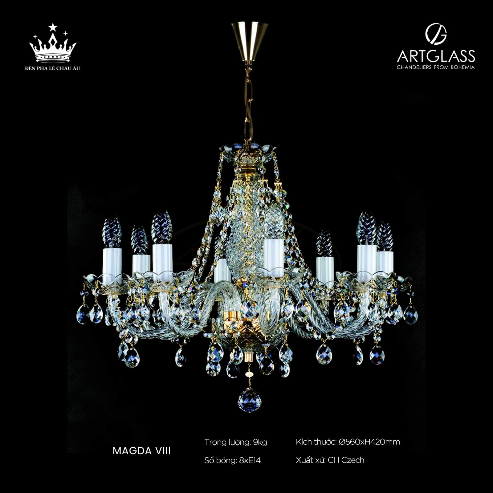 Một trong những dòng sản phẩm đèn chùm cao cấp được yêu thích nhất của thương hiệu ArtGlass chính là dòng đèn gọng pha lê với sự đa dạng về mẫu mã và kiểu dáng. Mặc dù có thiết kế tinh giản nhưng vẫn toát lên vẻ sang trọng đặc trưng, phù hợp với đa dạng phong cách kiến trúc và không gian nội thất khác nhau. ĐÈN GỌNG PHA LÊ MAGDA VIII là một kiệt tác trong dòng đèn pha lê cao cấp, kết hợp hoàn hảo giữa nét đẹp cổ điển và công nghệ hiện đại. Thay thế các ngọn nến truyền thống bằng hệ thống LED tiên tiến, cùng với việc sử dụng tay gọng pha lê thay vì chất liệu đồng cổ điển, tạo nên một thiết kế độc đáo và sang trọng. Chính vì vậy, mẫu đèn này là lựa chọn lý tưởng cho các không gian nội thất cao cấp đòi hỏi sự tinh tế và đẳng cấp.