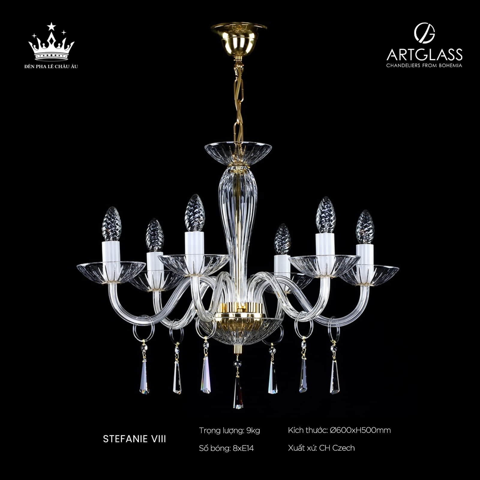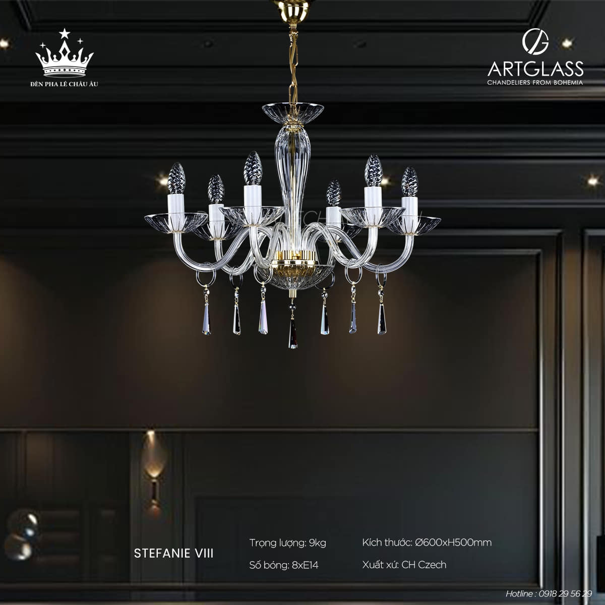 - Đèn Trần Pha Lê STEFANIE VIII là kiệt tác nghệ thuật tinh giản nhưng đầy cuốn hút của dòng đèn chùm cổ điển. Với 8 gọng đèn pha lê có độ cong sâu, tạo nên những đường nét mềm mại đặc trưng.