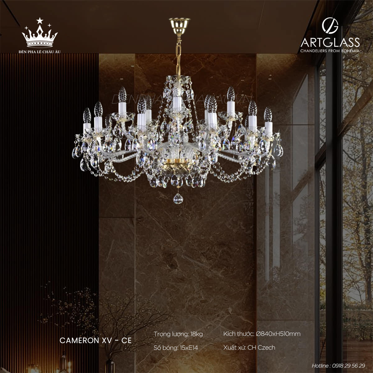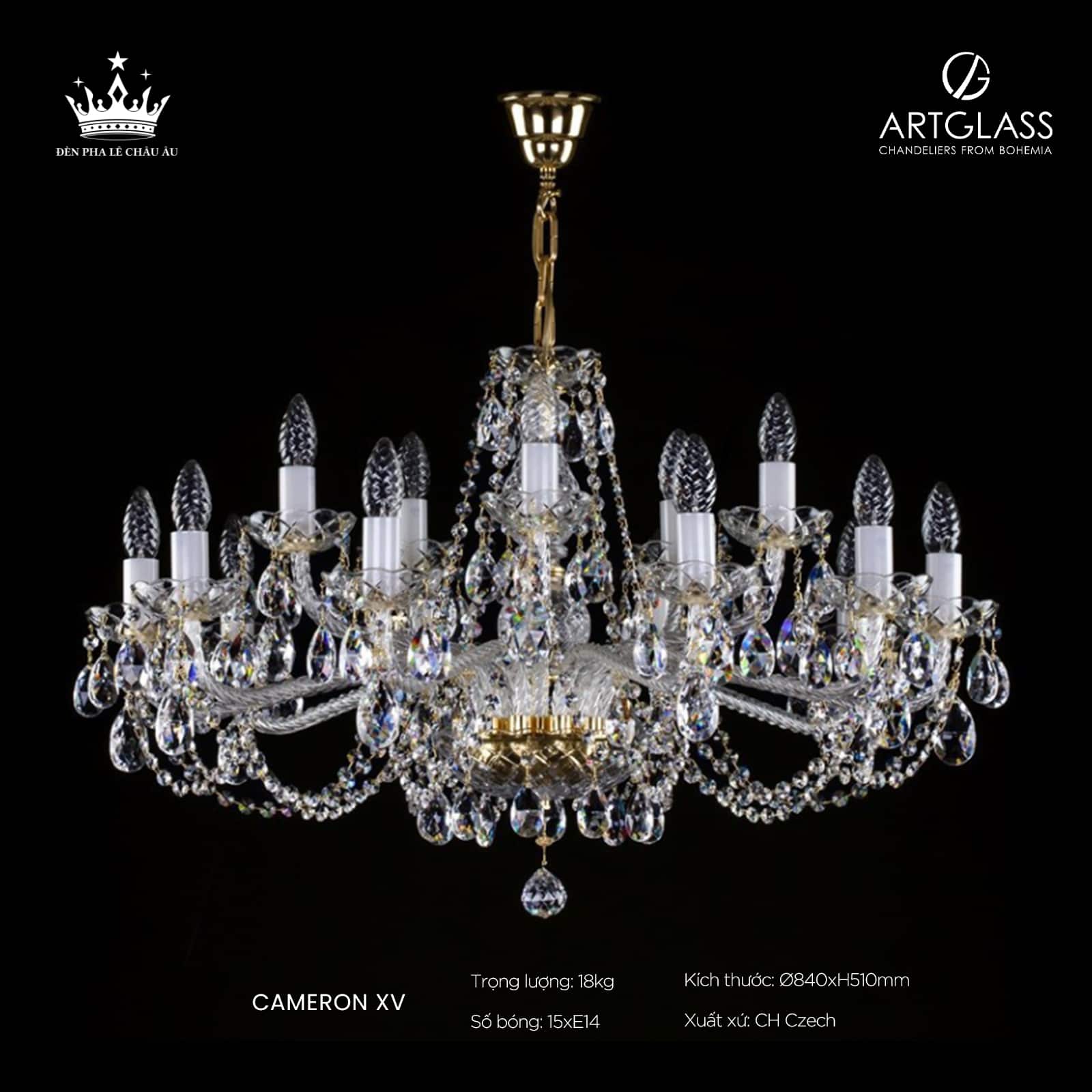 Đèn phòng khách CAMERON XV là một trong những thiết kế nổi bật thuộc dòng đèn gọng pha lê cao cấp của thương hiệu ArtGlass – thương hiệu đèn pha lê danh tiếng đến từ Cộng Hòa Séc. Sản phẩm thể hiện sự kết hợp tinh tế giữa nghệ thuật cổ điển và hơi thở hiện đại, mang lại vẻ đẹp sang trọng và đẳng cấp cho mọi không gian sống.