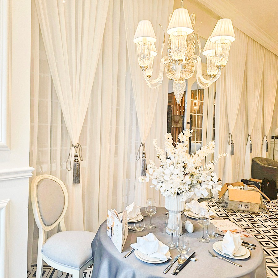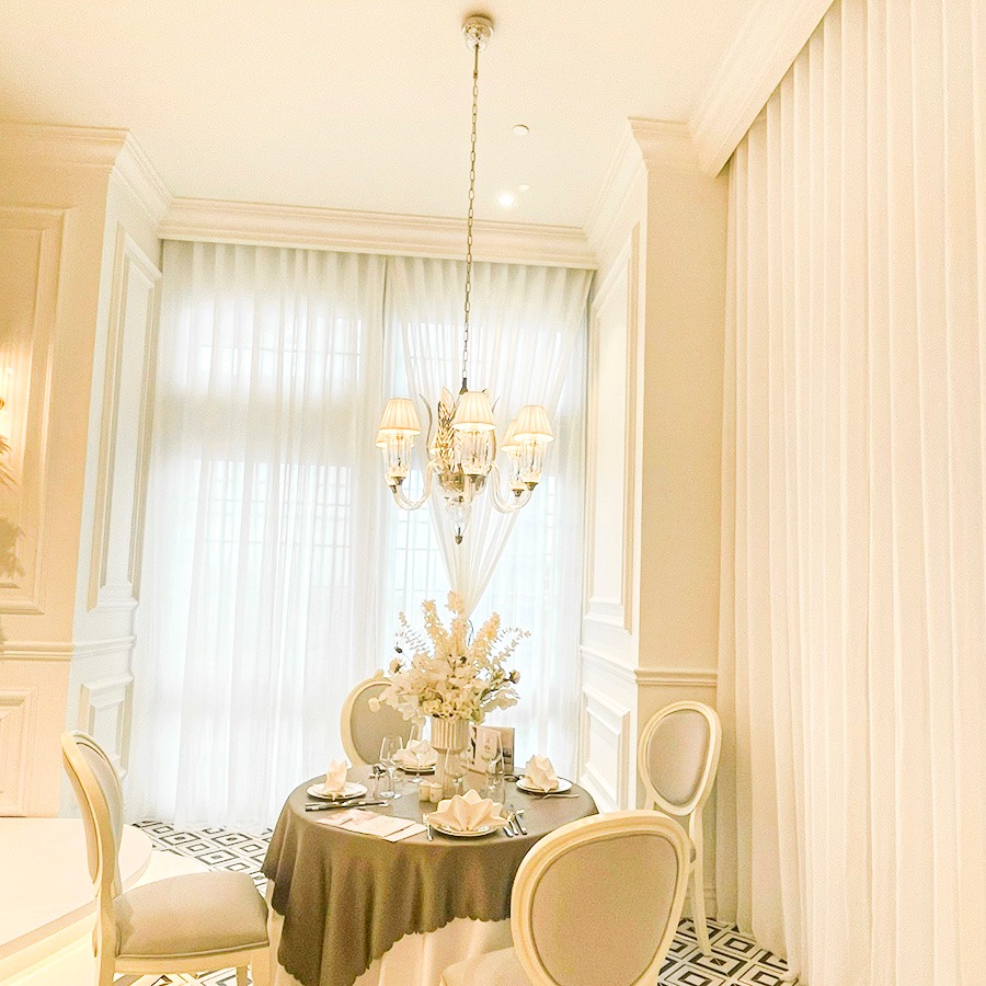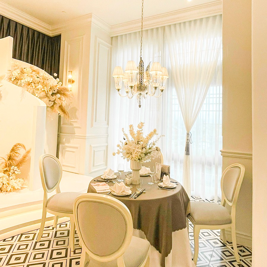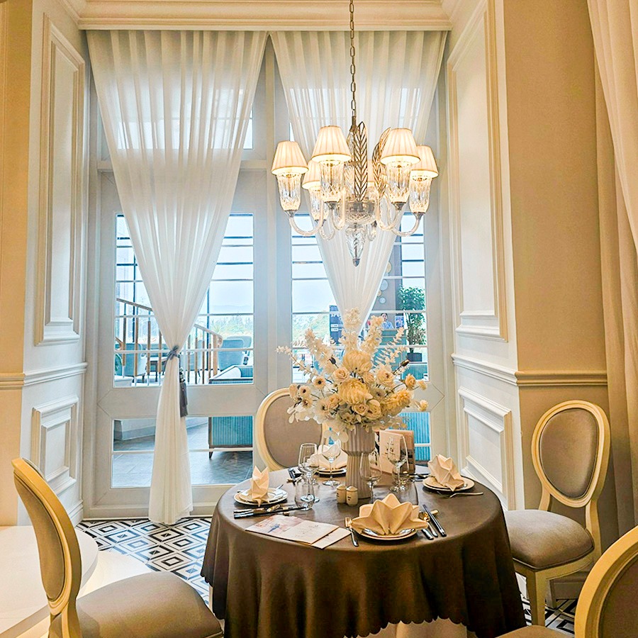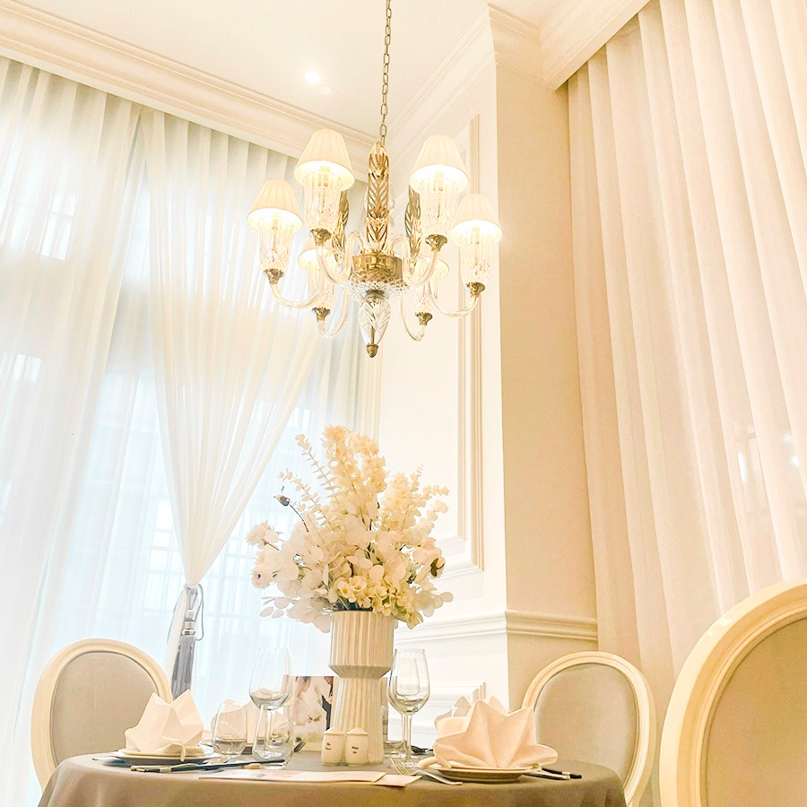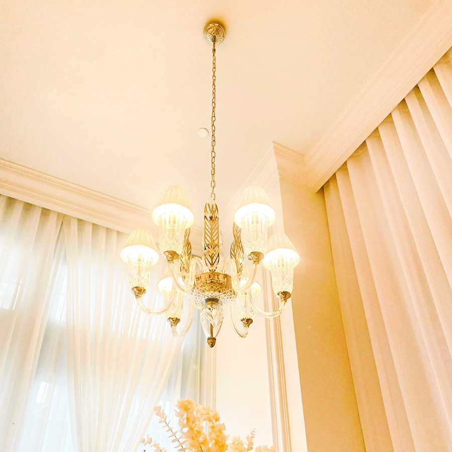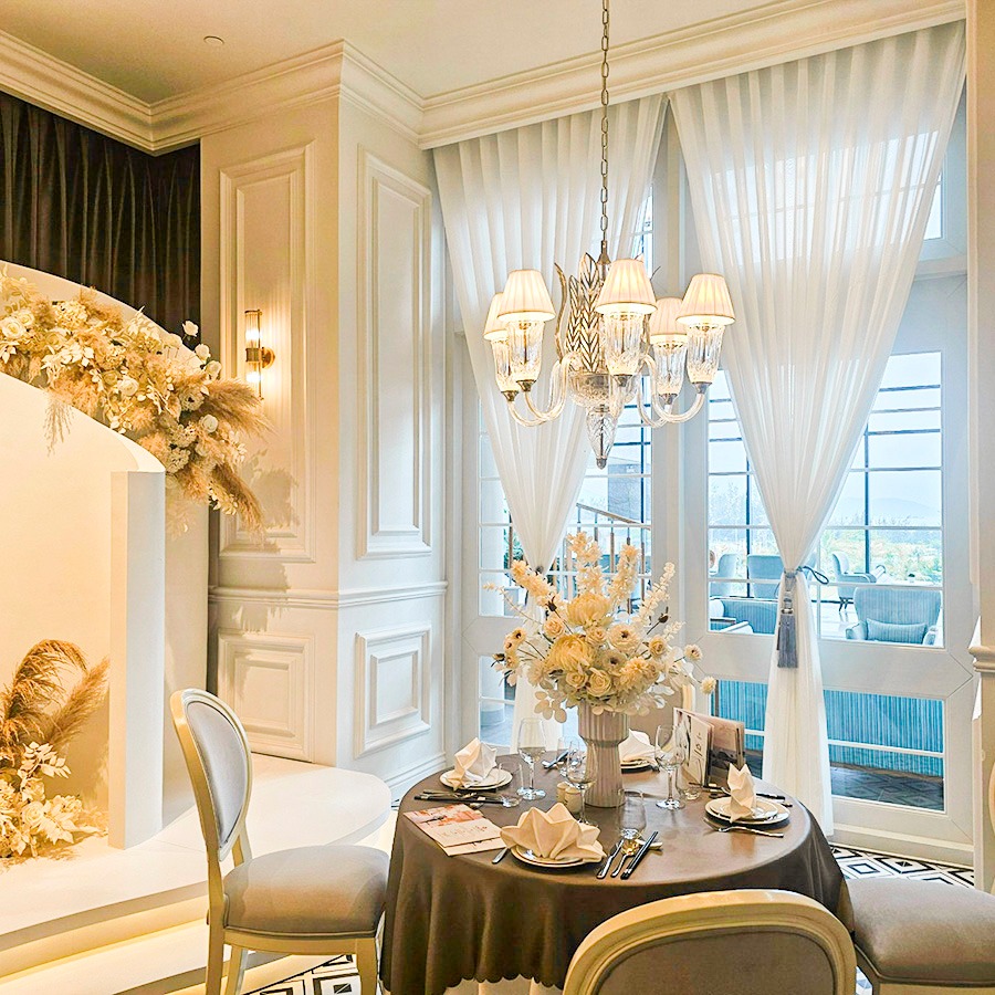 Ánh sáng lung linh phản chiếu trên từng hạt pha lê giúp không gian thêm ấm áp và đẳng cấp, đồng thời tôn lên kiến trúc sang trọng của khu nghỉ dưỡng.