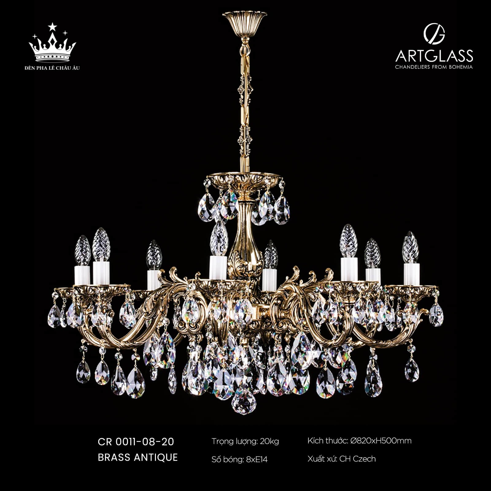 Mang đậm dấu ấn của phong cách cổ điển châu Âu, đèn chùm CR 0011-08-20 từ thương hiệu ArtGlass gây ấn tượng bởi sự kết hợp hài hòa giữa chất liệu đồng nguyên khối hoàn thiện màu Brass Antique và pha lê Tiệp cao cấp. Các chi tiết được chế tác tinh xảo tạo nên một tổng thể sang trọng, đậm chất nghệ thuật.