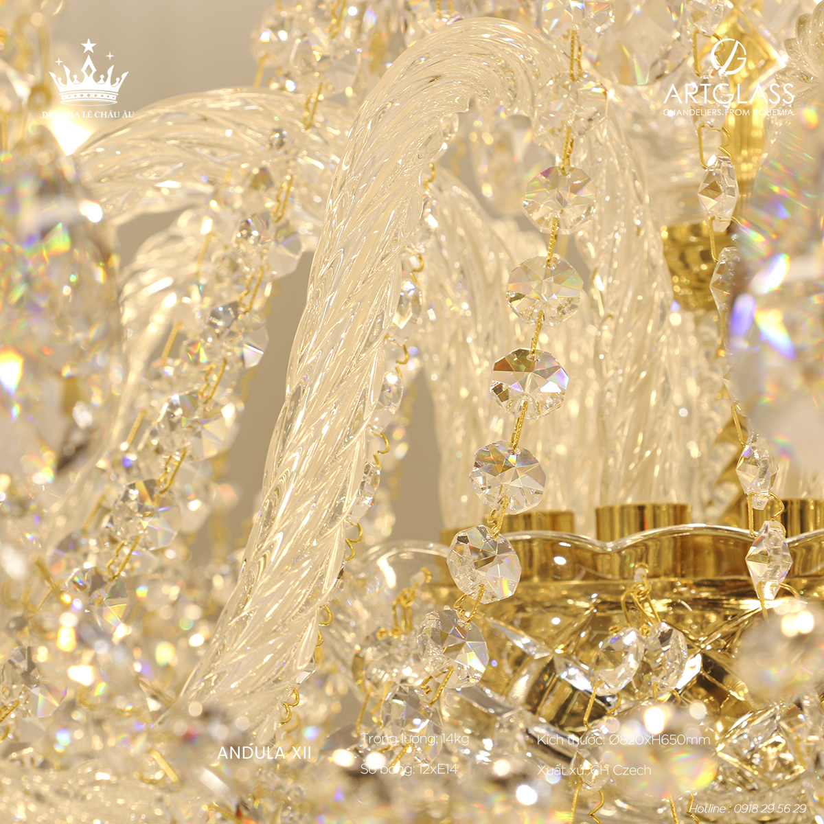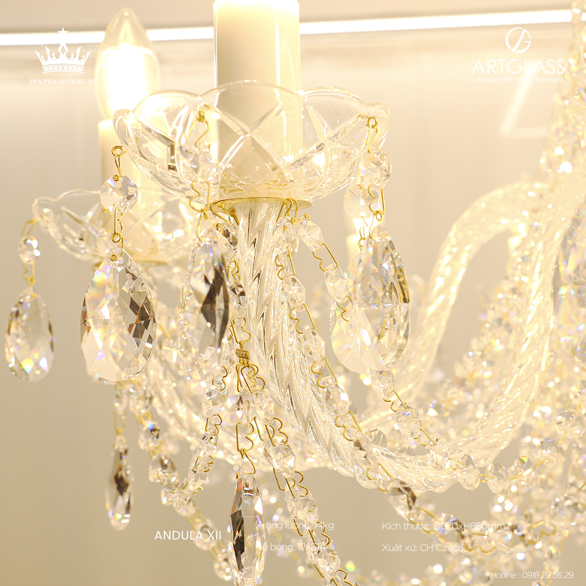 Điểm nhấn thiết kế: Mẫu đèn pha lê này kết hợp tinh hoa của phong cách cổ điển và hiện đại, thay thế các ngọn nến bằng bóng LED và chất liệu đồng truyền thống bằng các tay gọng pha lê chắc chắn, lấp lánh. Các chi tiết được chế tác tỉ mỉ, mang lại ánh sáng mềm mại, sang trọng, đồng thời khẳng định gu thẩm mỹ tinh tế của chủ nhân.