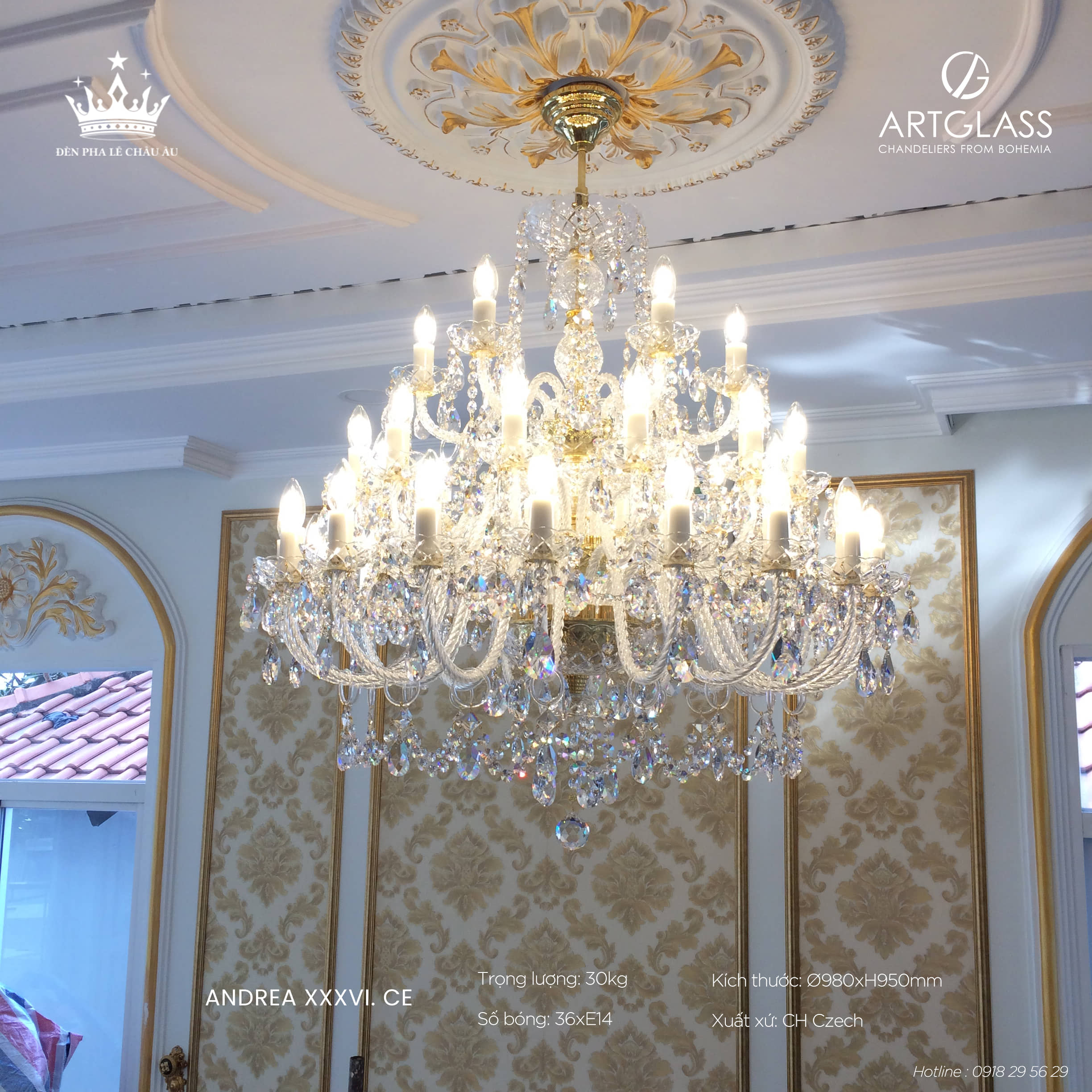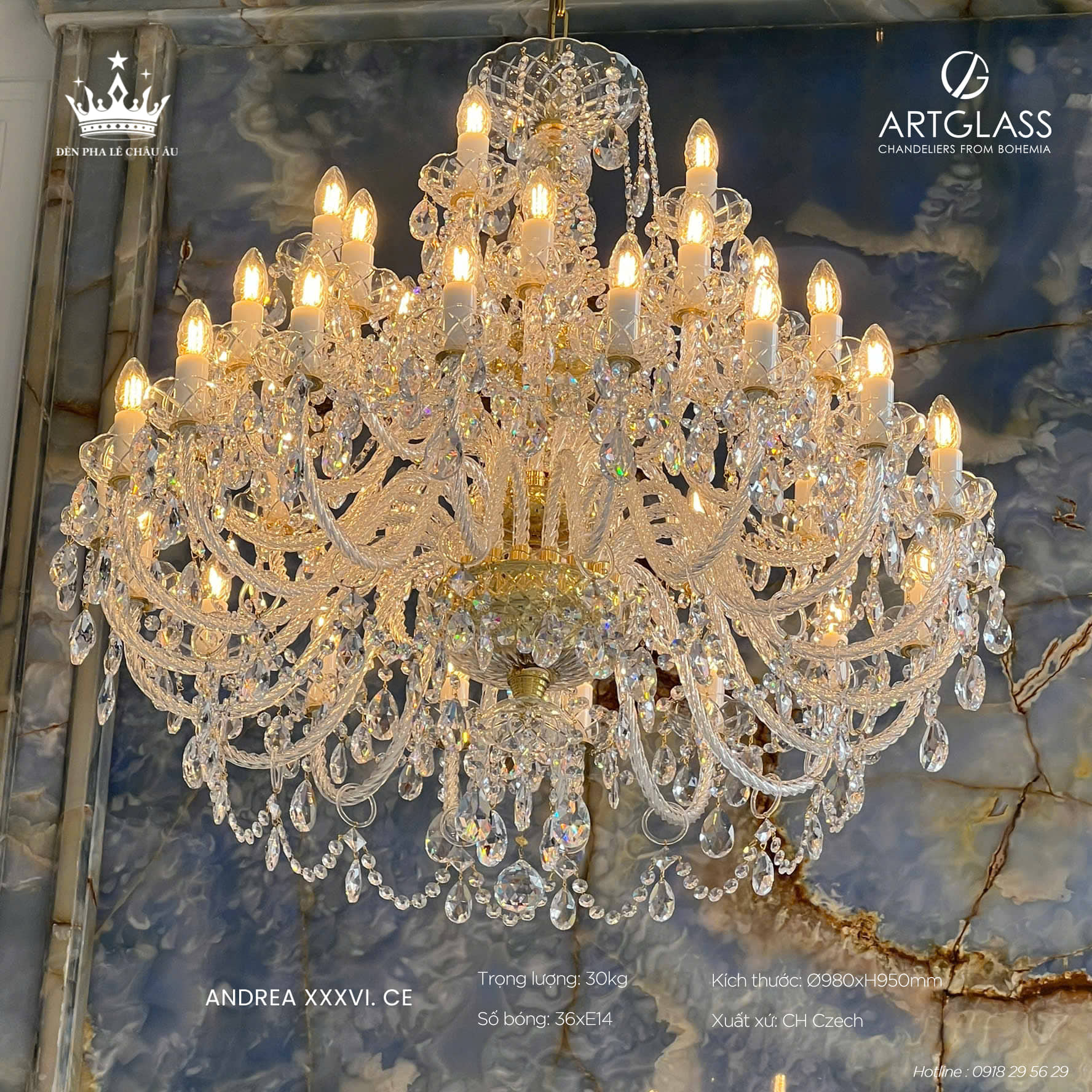 Với thiết kế nhiều tầng cùng các tay đèn xếp lớp cổ điển, ANDREA XXXVI là minh chứng sống động cho nghệ thuật chế tác pha lê thủ công của vùng đất Bohemia lừng danh. Mỗi viên pha lê được chế tác tỉ mỉ, đánh bóng hoàn hảo để khi ánh sáng tỏa chiếu, từng góc cạnh đều phản chiếu rực rỡ, tạo nên điệu vũ ánh sáng lung linh trên không trung.